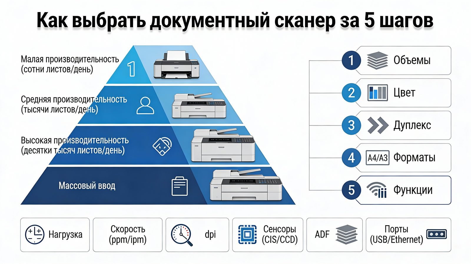 Рынок документных сканеров предлагает сотни моделей — от компактных устройств для домашнего офиса до промышленных комплексов, способных переваривать десятки тысяч листов в сутки. Разобраться в этом многообразии проще, чем кажется, если подойти к выбору системно.