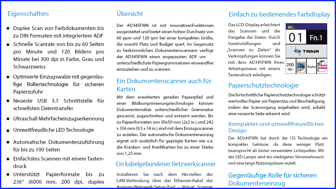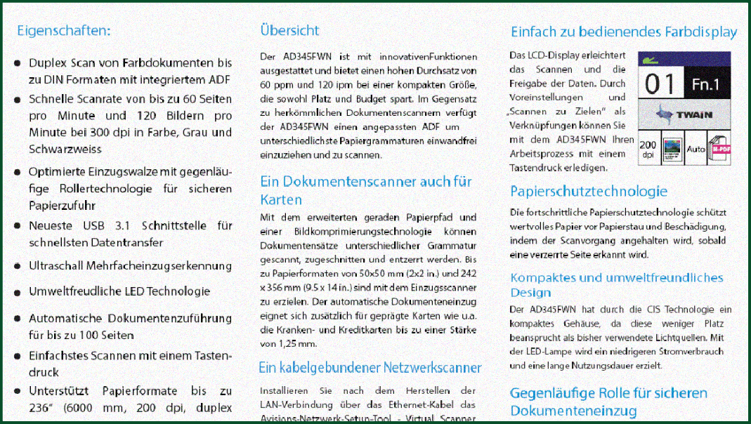 Avision разрабатывает собственные функции обработки изображений на основе пользовательского опыта. Эти полезные функции включают автоматическое определение цвета, автоматическое цветовое соответствие, удаление пустых страниц, шумоподавление, автоматическую обрезку и выравнивание. С этими функциями четкое готовое к использованию изображение можно получить при каждом сканировании! Сканирование стало простым как дуновение ветерка!