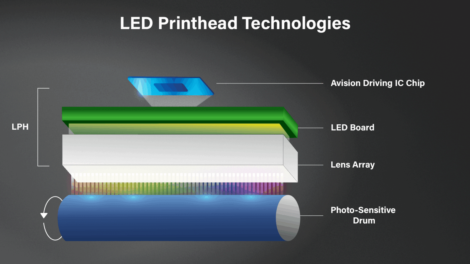 Модуль LPH состоит из светодиодов и массива линз Selfoc (SLA). Источник света, излучаемый каждым светодиодом, через SLA направляется на фоточувствительный барабан, тем самым формируя изображение, которое затем печатается на бумаге с помощью заряженного тонера.